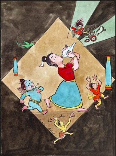 Birds chirp scriptures. The conch removes impurities (Putana) and keeps the body from straying in the wrong direction (Shakatasura).