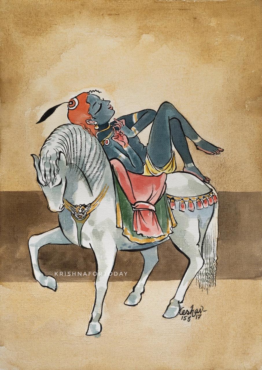 Krishna reclining gracefully on the horse's back, depicts a powerful message of mastery and surrender. It's as if Krishna is in complete command, guiding these restless energies with effortless ease.