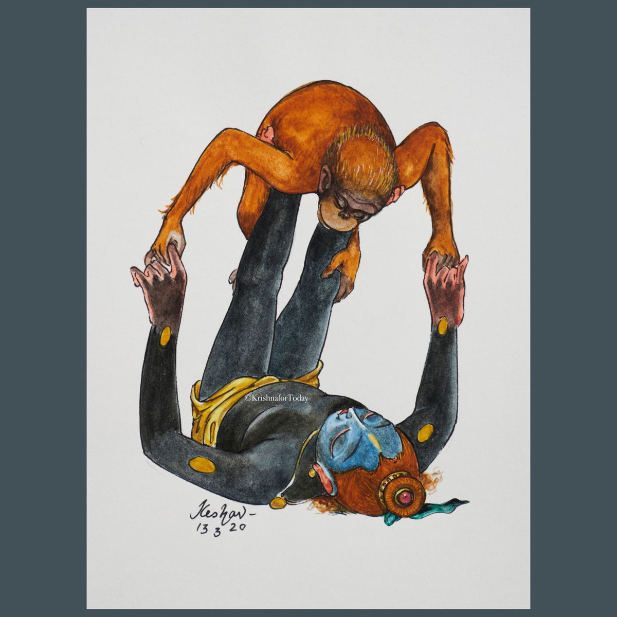 The monkey represents the mind. The orangutan means the wise man of the forest. Doesn’t have a tail. Very human. Wise. The saffron coat represents renunciation. All that the fickle mind needed to stabilise itself, was something to cling to. It found Krishna. The orangutan is Krishnapremi.
